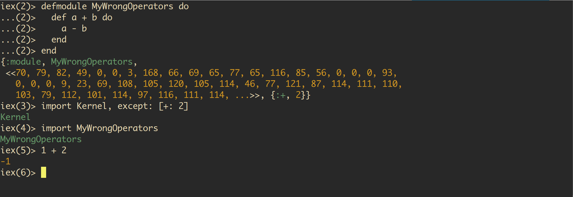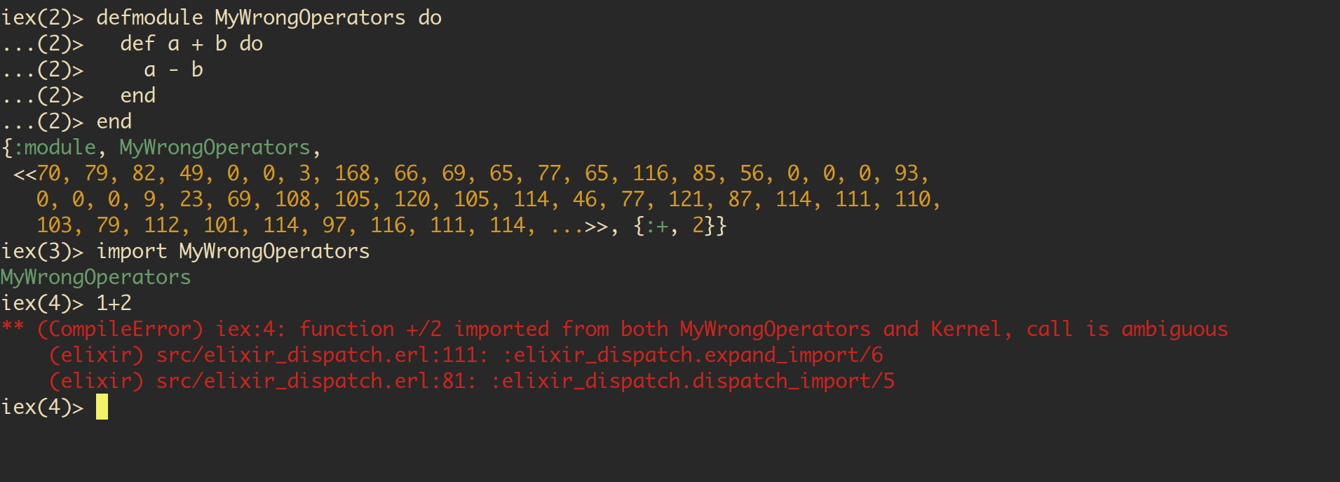 ** ** (CompileError) iex:4: function +/2 imported from both MyWrongOperators and Kernel, call is ambiguous