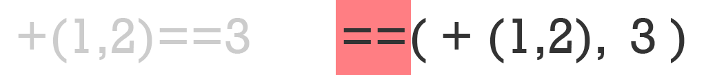 Similarly we break down the another infix operator == as ==(+(1,2), 3) just like we did for + nothing more fancy here.