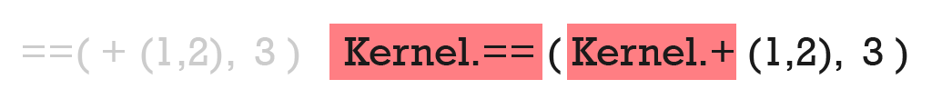 So, again we break down ==(+(1,2), 3) to Kernel.==(Kernel.+(1,2), 3)