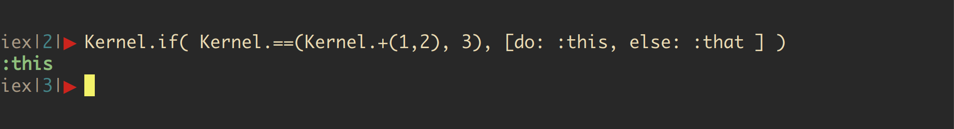 Kernel.if( Kernel.==(Kernel.+(1,2), 3), [do: :this, else: :that ] )