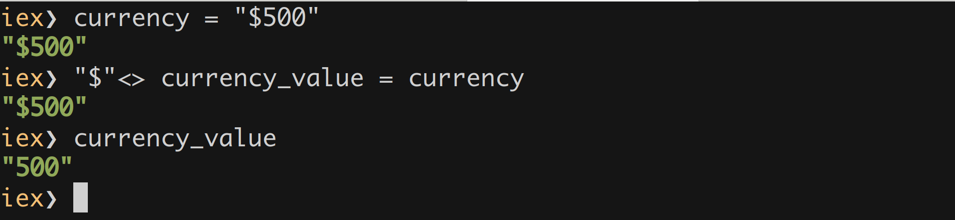 I need to take out the currency_value from the currency with a currency_symbol in a string. I know it is a weird example. I just want to convey the idea of pattern_matching over the strings.