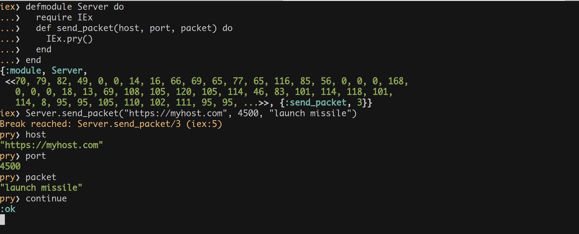 When I was a newbie in Elixir, I used to prefer writing IO.inspect than IEx.pry() . Even if I want to debug three or more variables, I used to write as many IO.inspect() .Though it does the job, it is not a recommended way.