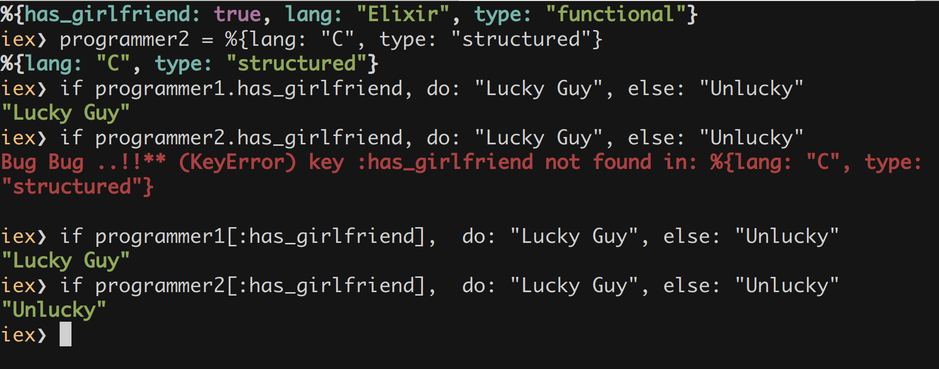 iex> if programmer2[:has_girlfriend], do: "Lucky Guy", else: "Unlucky"